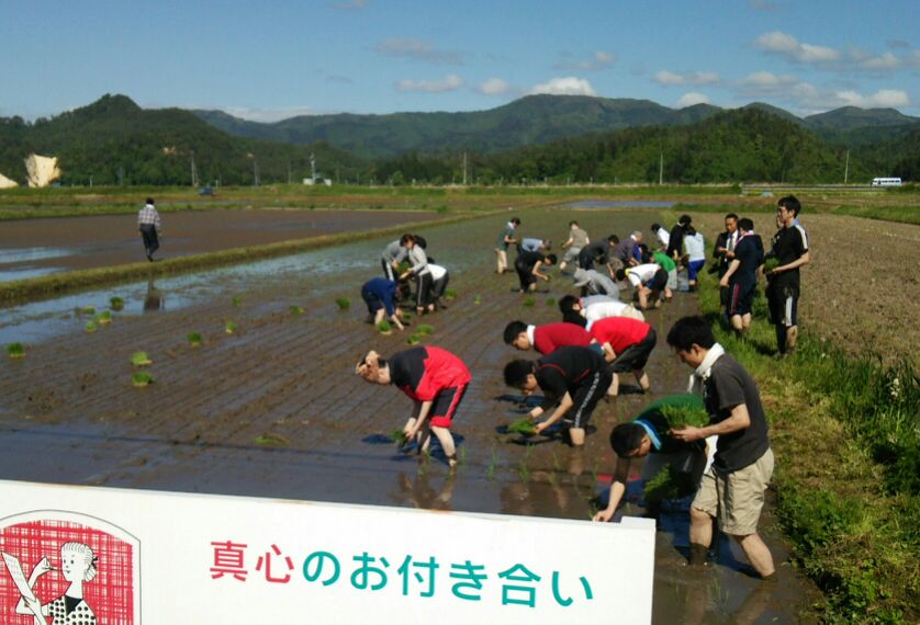 直播(種を直接蒔く方法)が終わり、移植(苗を植える方法)による田植えが始まりました。初日はレストランラケル様の14年目の田植です。社長以下31名の皆様が慣れた手つきで1反5畝(15アール)の田んぼを手植えしていきます。秋には15俵(900kg)前後のコシヒカリが収穫できる予定です。