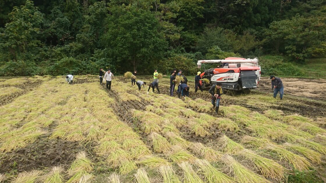 9月17日に始まった2018年の収穫作業も30%位進んだ中、本日は㈱イオンイーハート新入社員研修の仕上げである稲刈り作業研修が行われました。今年入社した15名が春の田植え、夏の草刈りに引き続きコシヒカリの手刈りを行いました。8アールの水田ですが、田植え以上の労働量とあって皆さん真剣な顔つきでした。