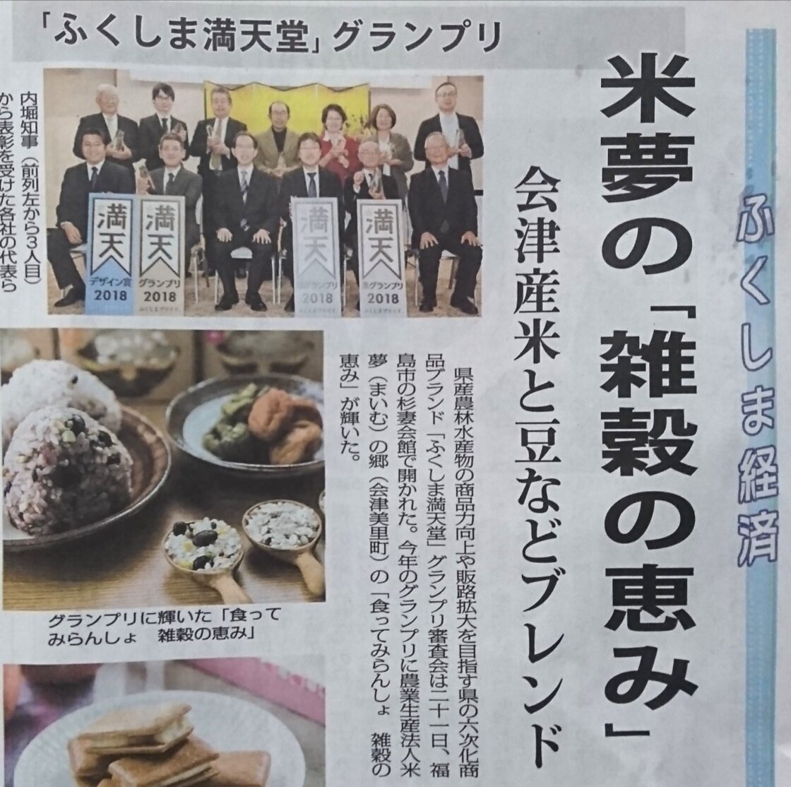 12月21日、弊社商品の「食ってみらんしょ雑穀の恵み」が「ふくしま満天堂」の優良商品を決める最終審査で170点の中からグランプリとデザイン賞をダブルで受賞しました。「ふくしま満天堂」とは6次化商品の商品力向上や販路拡大に向けて福島県が創設した商品ブランドで、本年度は67事業所が登録し、事前審査で首都圏の食品バイヤーが最終審査に進むプレミアム10点を選び、その中からの受賞でした。