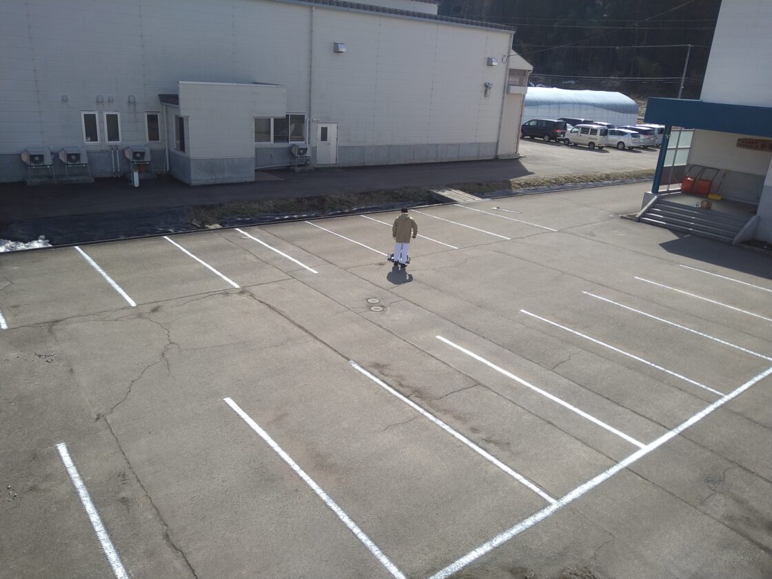 駐車場の雪が解けてなくなり、天気も良いので、薄くなった白線の引き直しをしました。2年に1回程度自分たちでやっています。