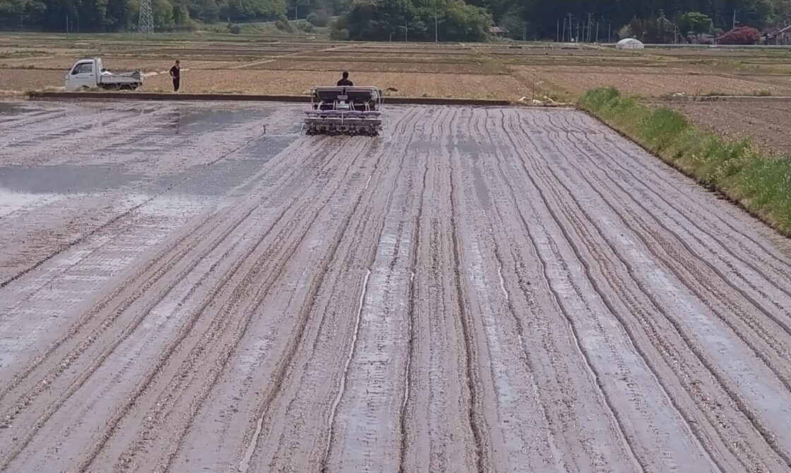 直播開始 2023年6月15日2023年5月8日 田植第一弾、コシヒカリの直播が去年より5日早く5月1日に始まりました。当社ではまだまだ少なく全体の8%程度で、コストの兼ね合いからもっと増やさなければならない状況ですが、気温、水等の問題があり簡単には進みません。