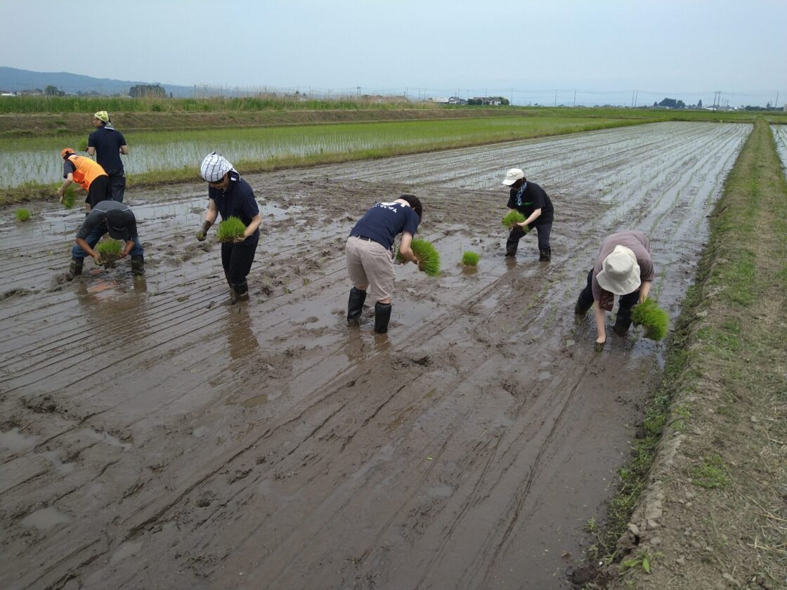 田植体験 2023年6月15日2023年6月8日 地域おこし協力隊員など7名による田植え体験を行いました。会津美里町に移住して、陶芸や鳥獣駆除、観光発信等の業務を遂行する若者たちです。初めての体験だそうで泥に足を取られながらひと汗かいていました。