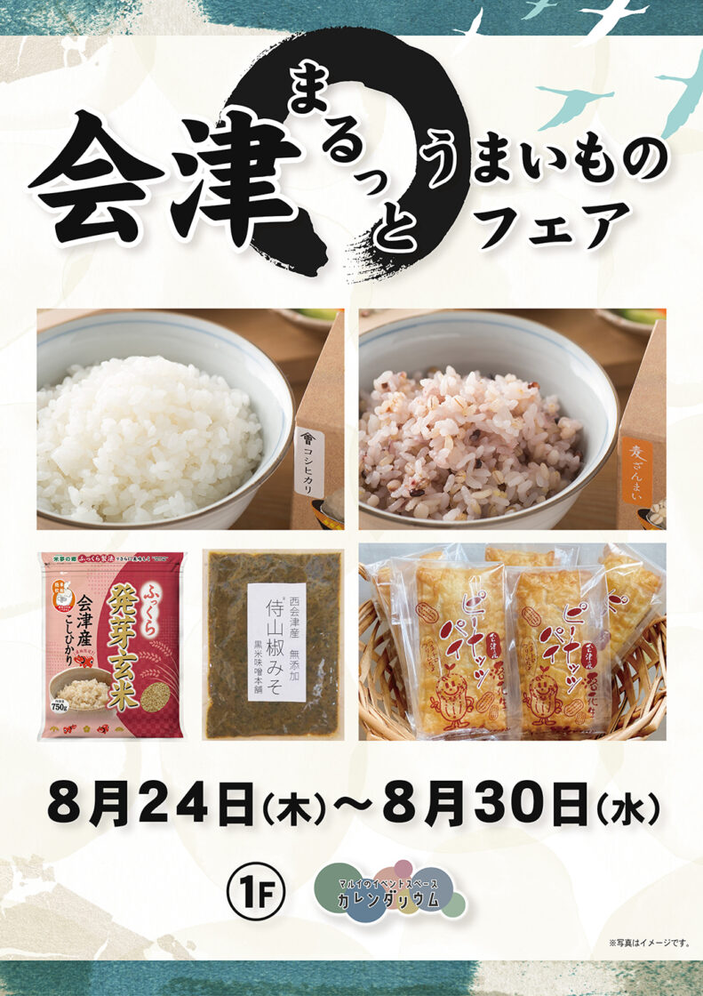 マルイファミリー溝の口店の1階カレンダリウムで「会津まるっと!うまいものフェア」を8月30日まで開催しています。県外であまり販売されていない会津の人気商品、こだわり商品が販売されています。当社も雑穀米や発芽玄米などを販売していますので、お近くの方は是非この機会にご覧になっては如何でしょうか。