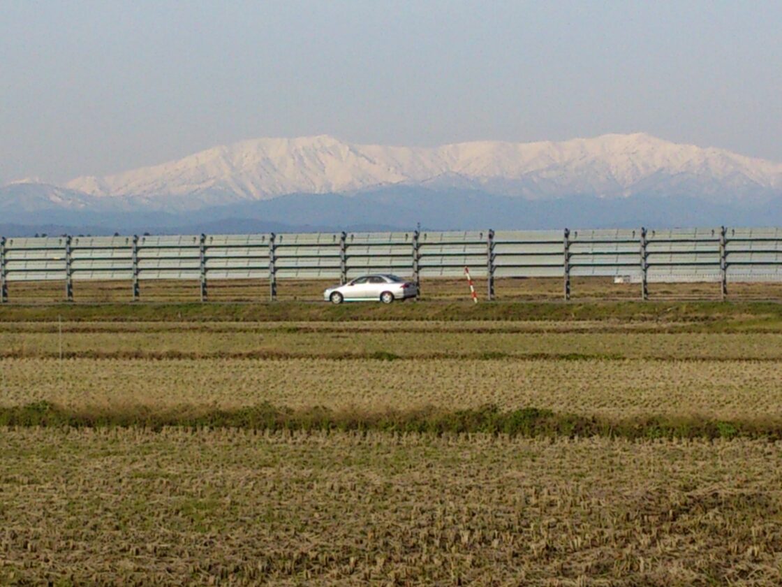 本格的な冬が到来する前に周辺の道路では風雪除けが設置されました。強い北西の風で巻き起こる地吹雪から道路の安全を確保するために毎年設置されています。周りに建築物がなく田んぼだけが広がる地域では大変有効な設備で3月まで活躍します。奥に見えるのは山形県、新潟県との境界にある飯豊山(2105m)です。