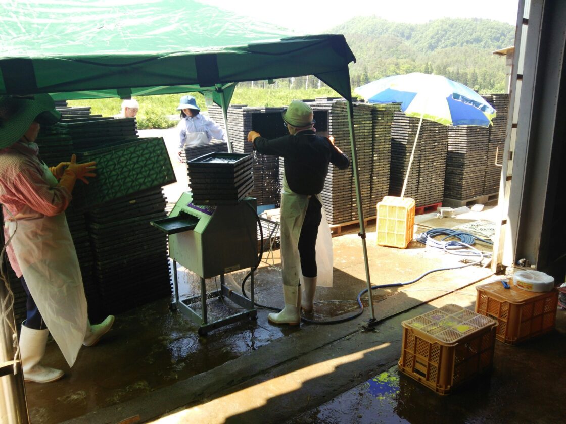 今年の田植が終了し苗箱洗いに汗を流しています。今年も50haを超える田植えをしたので苗箱の数も多く、6月の異常な猛暑の中の作業は一苦労です。