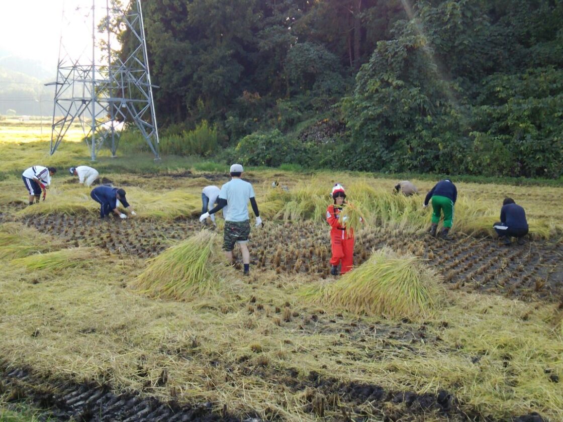 株式会社イオンイーハート様の第3回目の秋の収穫研修が行われました。全国のおひつごはん店舗から店長さんたちが会津に集まり、春に田植えしてたわわに実ったコシヒカリを手刈りで収穫しました。今年は天候にも恵まれ最後の1本まで刈ることができました。