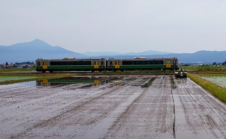 今年作付けする85haの田植えも中盤入りました。今日は、新型田植え機をお借りしての疎植試験が行われました。スピードを落とすことなく、またGPSを利用して自動操縦で植えていく新型機械に感心しました。背景は只見線と磐梯山です。