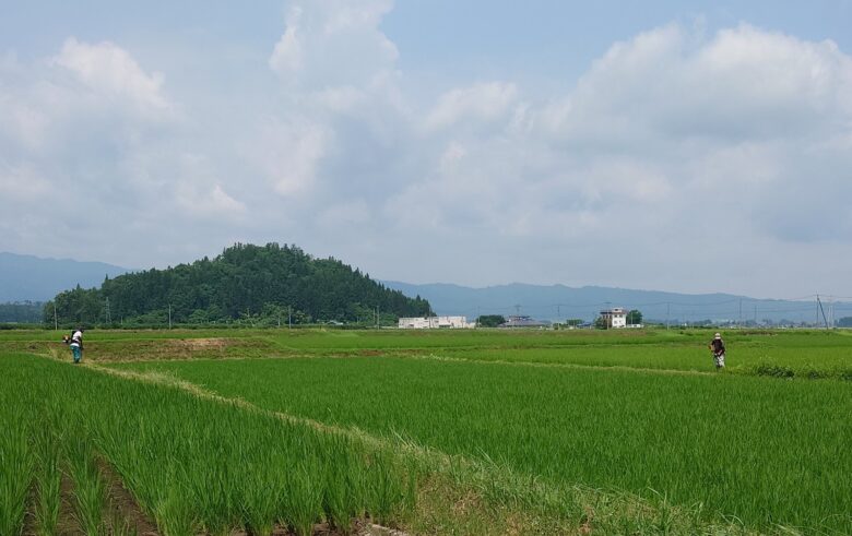 今年の田植えも飼料用米を最後に終了し、今は5月に田植えをした圃場の溝切り作業と、畦の草刈り作業中です。田植え後の畦は、除草剤散布は一切せず草刈機を使っての除草になります。今年は6月中からの猛暑で人も稲もヘトヘトです。