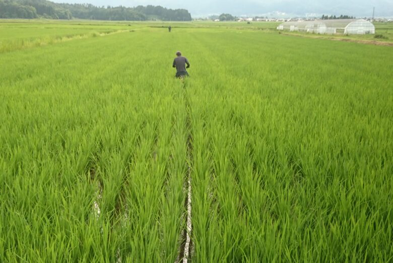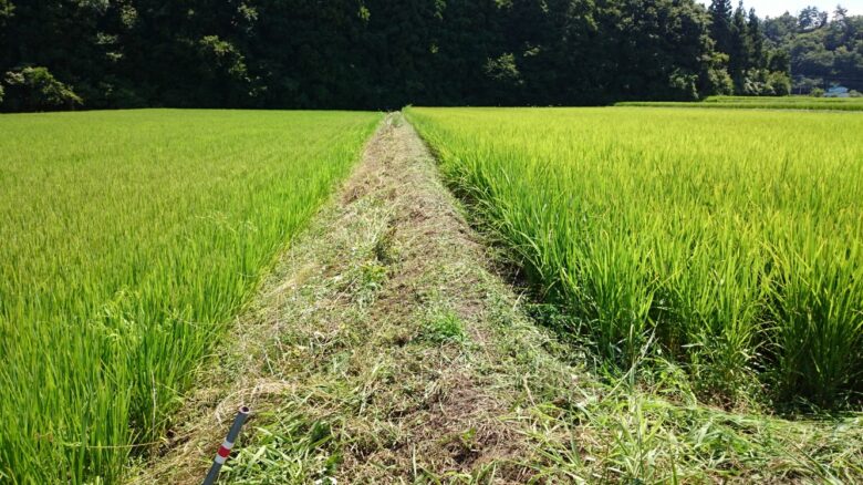 コシヒカリ出穂前の除草作業のお盆前最後の追い込みです。稲の養分を食すカメムシが住み着かないように畦畔の除草を行いますが、今年は気温35度以上の日が続いており日中の作業がとても厳しい状況です。時間帯を変えたり作業体制を変えたりして、なんとかこなしています。また、今年は雨がほとんど降らず、水管理にも相当苦労しています。