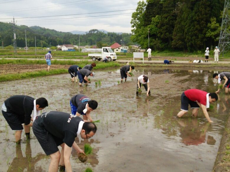 全国に「おひつごはん四六時中」を展開しているイオンイーハートさんの農業体験が行われました。農業研修4年目で、今年は新入社員さんが中心となってコシヒカリの手植えを行いました。若いだけあって動きが早く予定時間より30分早く無事終了しました。今後は夏の草刈りと秋の稲刈りが計画されています。