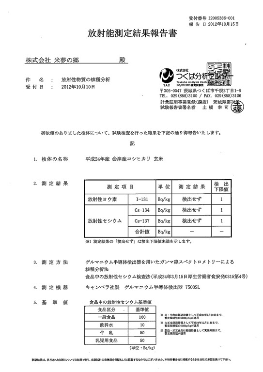 会津地区でも24年産のお米は全袋検査を実施して安全安心をお届けすることは既報しましたが、別に米夢の郷でサンプリングで実施した、ゲルマニウム半導体検出器での精細な検査の結果も1ベクレル下限値で不検出でした。