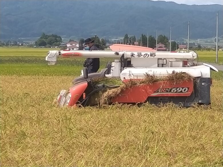 令和3年の稲刈りがコガネモチから始まりました。今年は当初暑い日が続き稲刈りも早まるのではないかと予想されていましたが、お盆明けからの雨模様と低温で昨年並みとなりました。里山のつぶ、ひとめぼれ、ミルキークイーンとすすみ、コシヒカリは10月に入ってからになります。