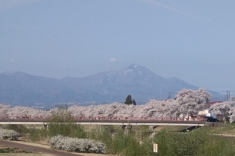 最近にない多雪の冬で春を心配していましたが、急に暖かくなって今年の桜は例年より10日ほど早く咲き誇ってます。宮川の桜並木と雪の残る磐梯山が綺麗です。夜にはライトアップされています。