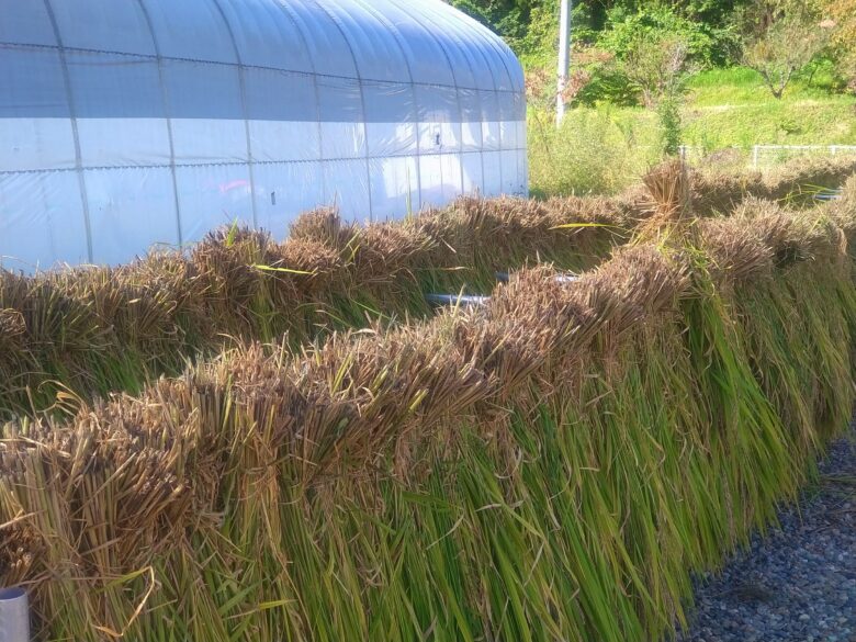 14日に始まった稲刈りも1か月が経とうとしていますが、ようやく半分が終了しました。この周辺のコシヒカリの多くが倒伏していて手間がかかっています。今年は古代米と言われる黒米(朝紫)の栽培にも取り組みました。これは、発芽玄米やたかきびなどをブレンドした「発芽&雑穀」という商品用で、これまでの生産者が高齢になったため自社で取り組みました。コンタミしないようにハゼ掛けで自然乾燥させてから脱穀します。